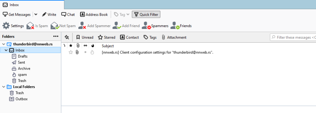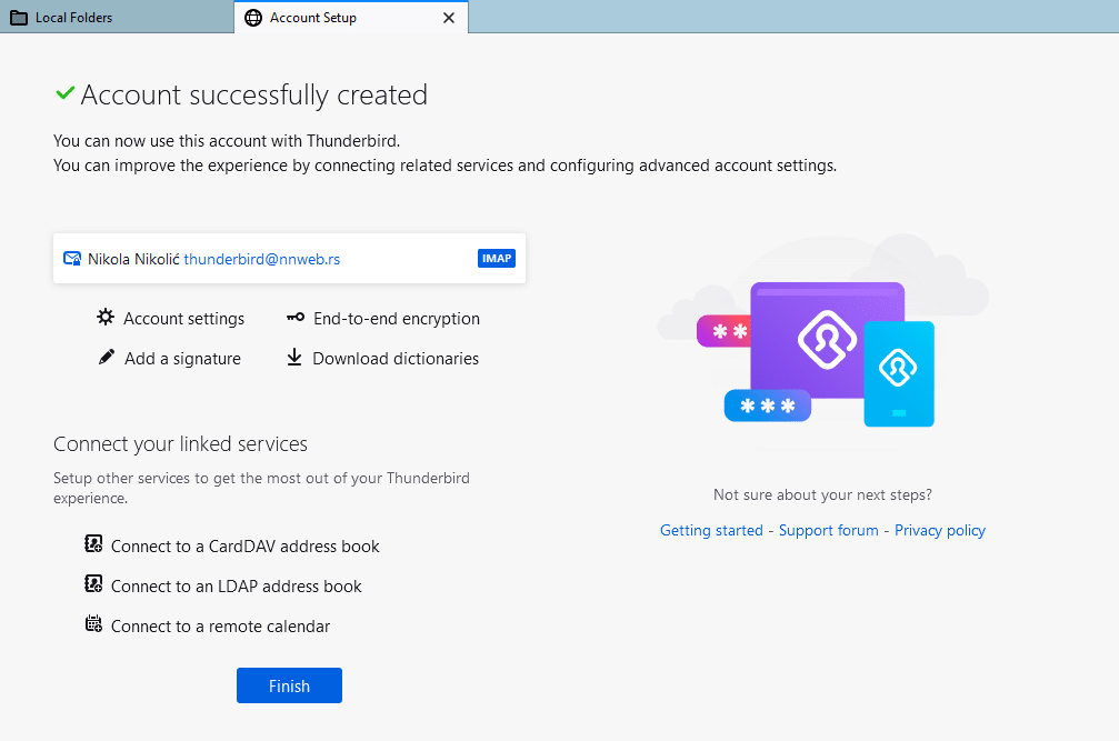 Incoming server u mom slučaju je 143, a Outgoing je 587. U tvom slučaju može biti drugačije pa je potrebno da zaviriš u mejl koji je kreiran u cPanelu. Ovako izgleda moj (Pic-9). Na kraju će se pojaviti novi prozor gde je potrebno da klikneš na dugme Finish (Pic-10). I, tvoj mejl je spreman (Pic-11).